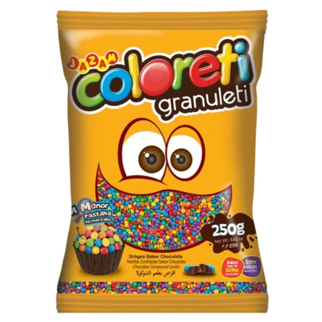 Ingredientes: Açúcar, gordura vegetal fracionada, cacau em pó, glicose, massa de cacau, maltodextrina, sal, emulsificante lecitina de soja, corante inorgânico dióxido de titânio (INS-171), glaceantes cera de carnaúba e INS-904, corantes (conforme descrito a seguir para cada cor) e aromatizante.